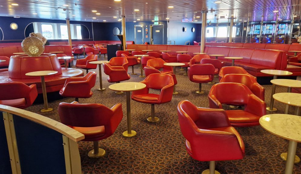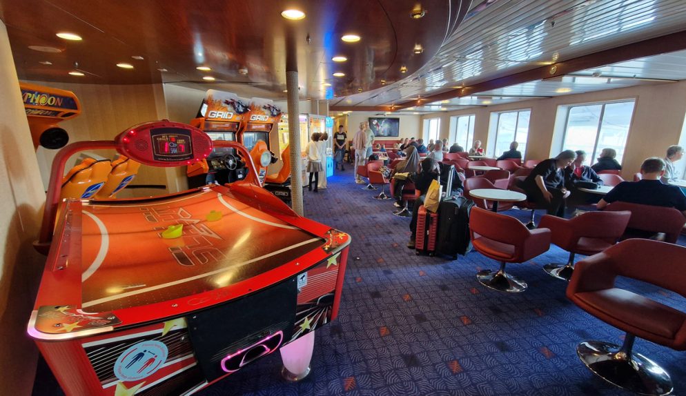 Jag passade på att snabbt fota de olika utrymmena innan alla hade brett ut sig och hunnit ombord, trots att det var sensommar var det nämligen fortfarande gott om semesterfirare i rörelse. Utöver olika lounger, vilstolar och barer finns större ytor för det mesta såsom arkadspel, lek och shopping.