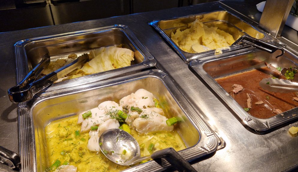 Efter en macka på kavring och skagenröra, lite lax och sallad var jag redan i princip mätt men barnen smarrade på köttbullar och kycklingvingar med mera. Min man satsade på fisken med mos och ringlad sås över…alla kunde njuta av det som de kände för och – tyckte man om något extra mycket var det förstås bara att ta mer.