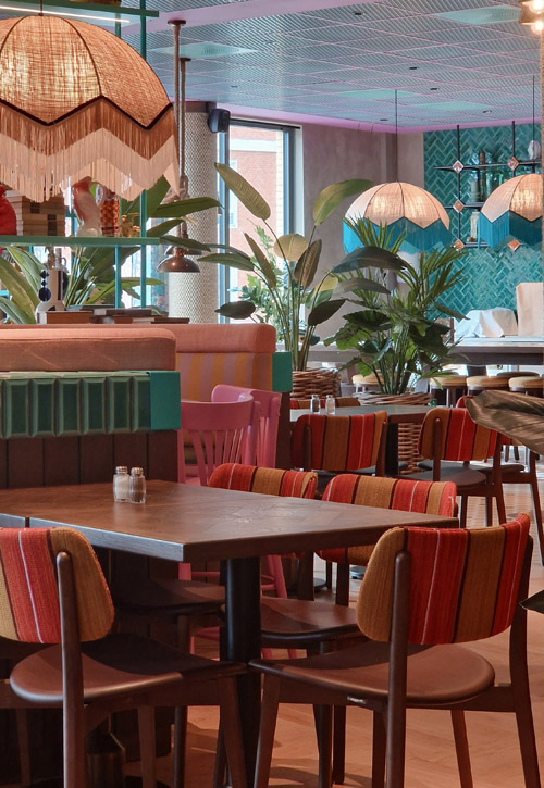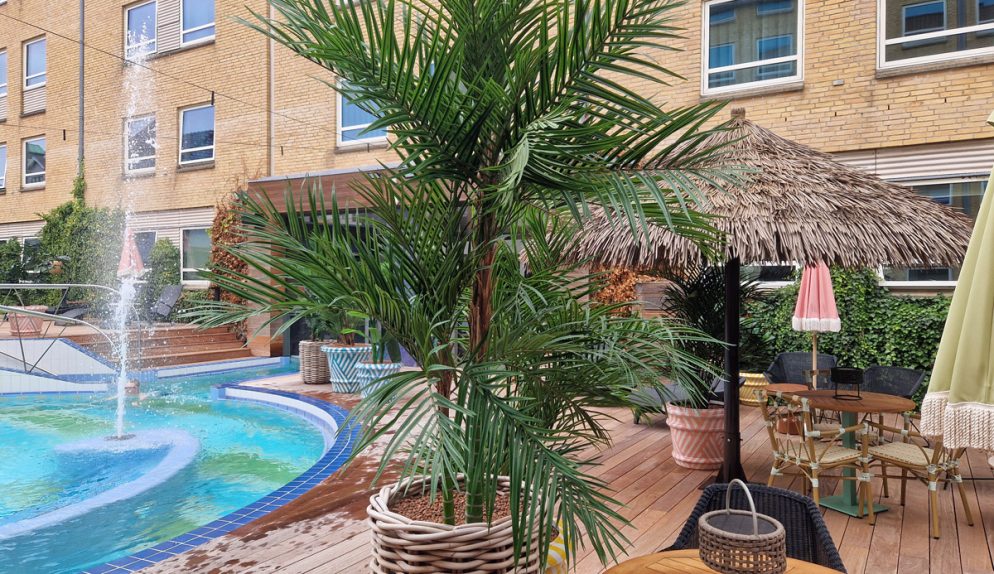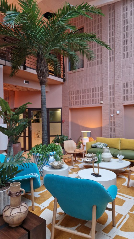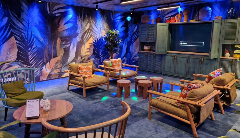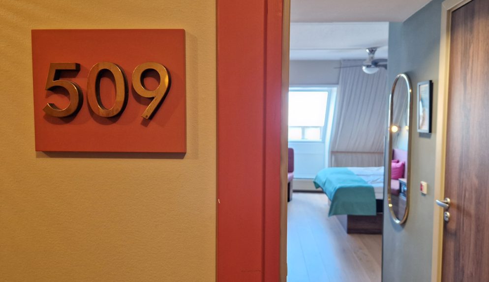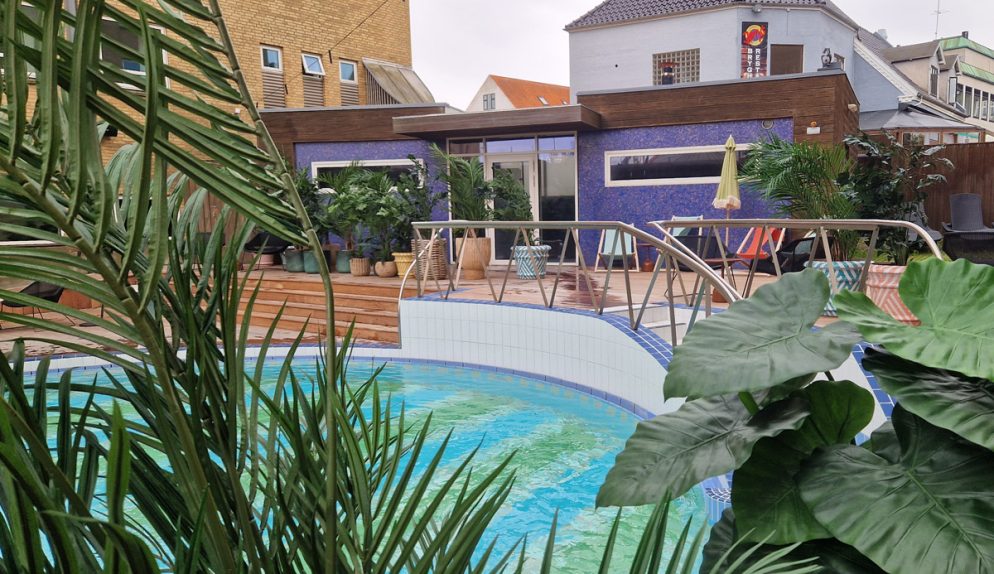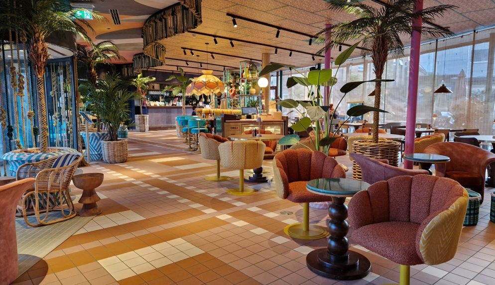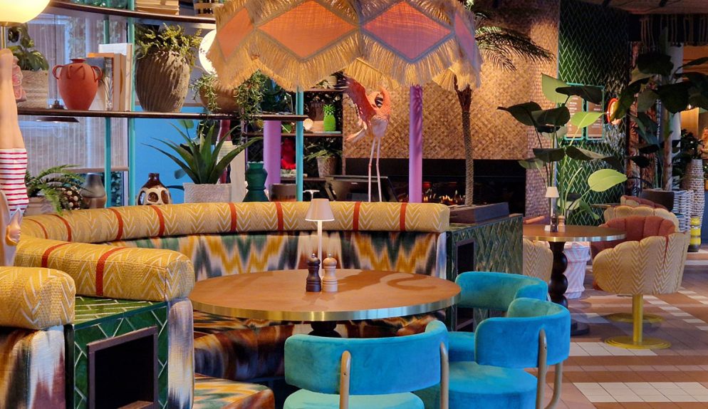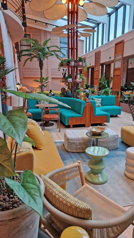 Skulle det vara kö vid incheckningen är det dock inga problem, den spännande inredningen i glada färger ger mycket att titta på. Redan i receptionen kan man också se en glimt av badlandet, eller snarare nederdelen av en pool. Stolarna framför är formade som snäckskal, överallt finns roliga inredningselement – det känns nästan lite som att kliva in i ett lekfullt cirkustält!