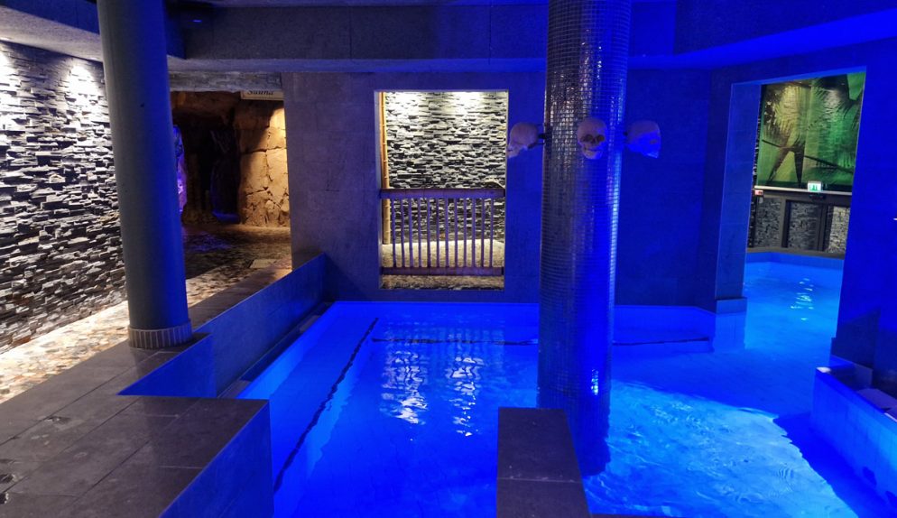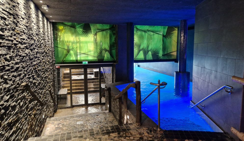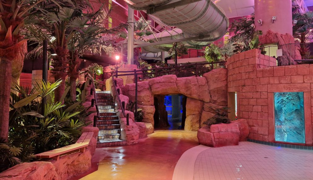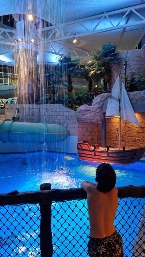 Känslan är tropisk, det är som att kliva ut i en djungel. Luften är varm och skön och här bjuds man både på ljud, ljus som ändras och andra sensoriska upplevelser som regn och ”åska”. När ”ovädret” kommer blir det också vågor i stora poolen, jättespännande tyckte vår 9-åring förstås!