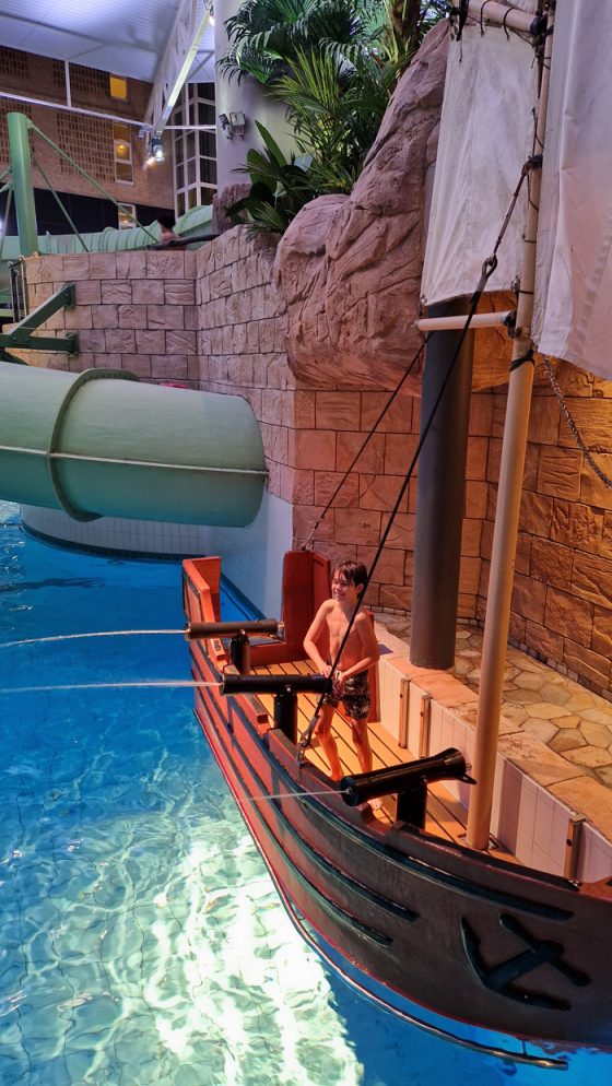 I stora poolen finns också ett piratskepp med kanoner som kan skjuta vatten och härifrån var det också tillåtet att hoppa. Theo gjorde förstås volter, akrobatisk som han är!