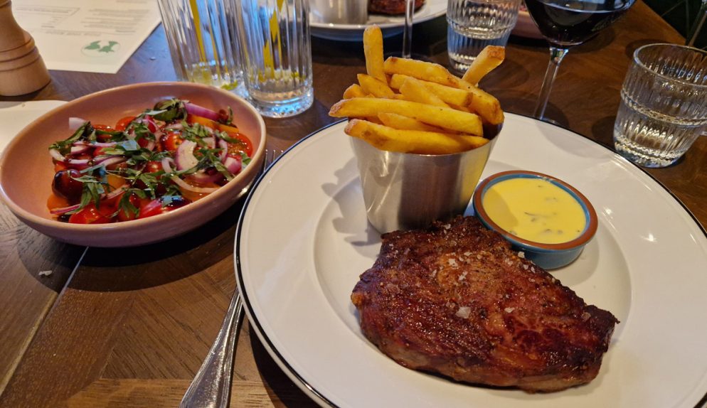 Sedan var det lite rockad på rätterna, denna gång var det vi föräldrar som tog biffen och äldste sonen som valde bugaren. Yngste Theo åt bara chips, frites och glass! Ja vad ska man säga…glass är också mat?