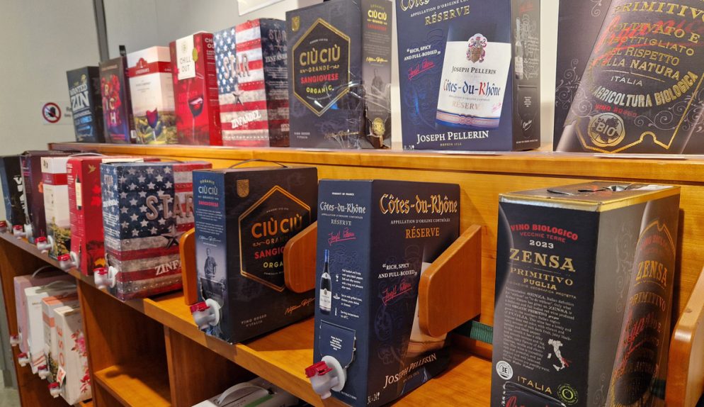 Ville man provsmaka var det inga problem där heller. Längs en vägg stod alla sorter uppställda och glas fick man i kassan. Bra service så man slapp köpa grisen i säcken…eller borde jag säga boxen? Jag smakade på några av dem och tyckte mest om Côtes-du-Rhône-vinet Joseph Pellerin.