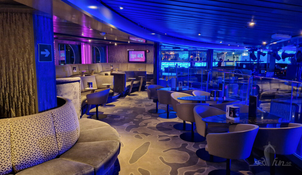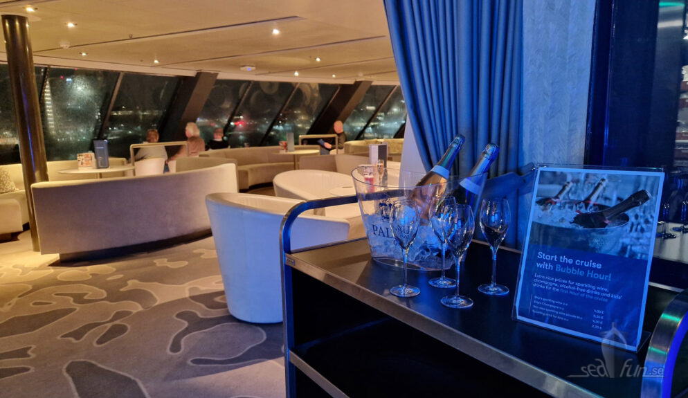 Sagt och gjort, här skulle njutas på äkta kryssningsvis. Jag stegade iväg till Seaview bar (japp, den hette också Seaview), beställde ett glas av fartygets champagne för överkomliga 8,30 euro och slog mig ner bland paren som hade det lite romantiskt…fast jag själv då. I couldn’t care less, helt bekväm var jag och nöjd – över champagnen, att jag var på väg och barens läge i fören – även om allt jag såg var glittrande lampor i mörkret.