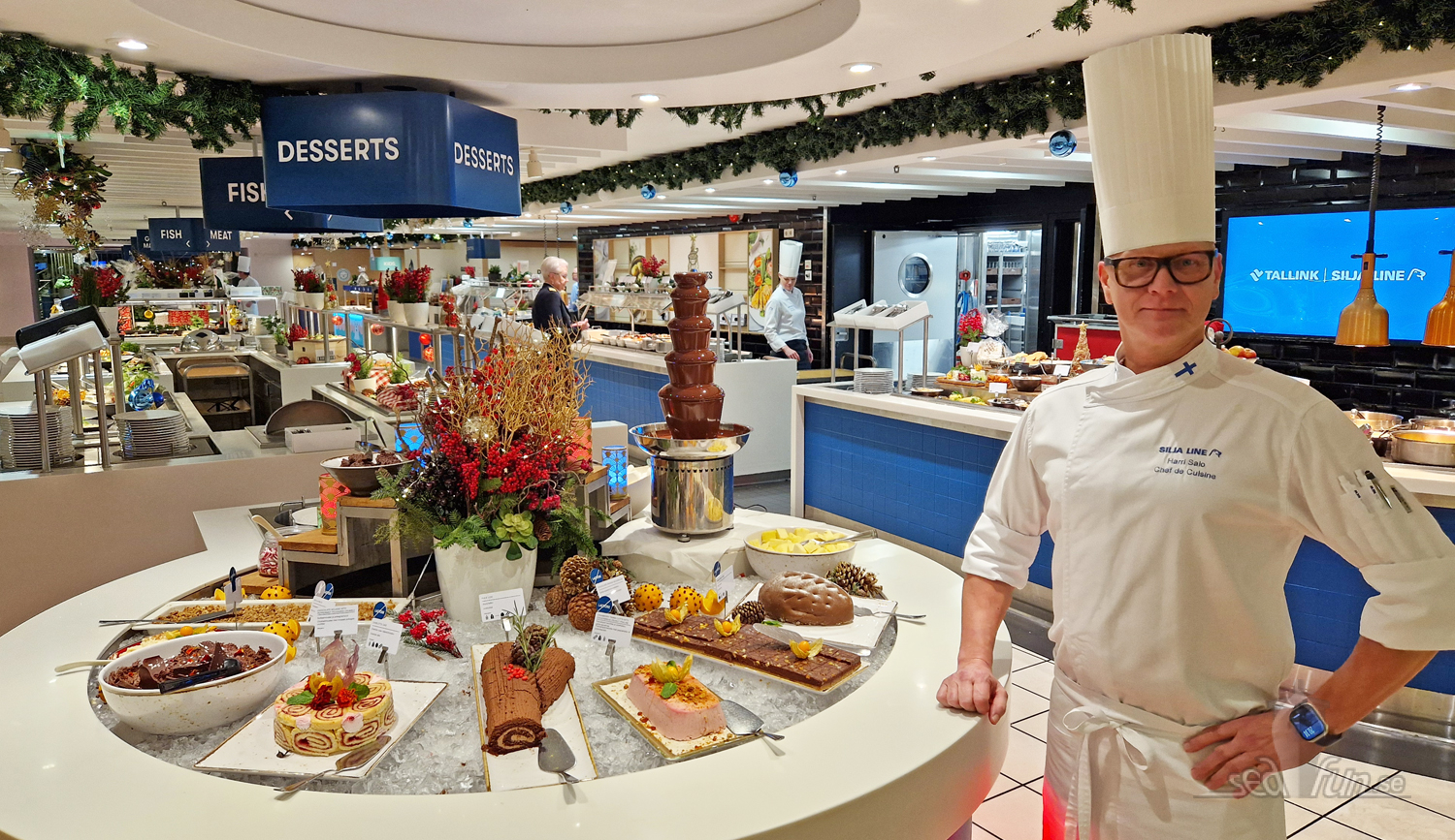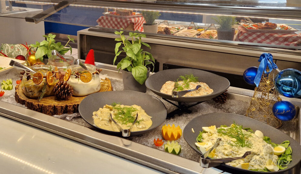 Harri berättade att Silja Serenades julbord består av över 100 rätter. Allt lagas inte ombord, men det gör det inte hos de andra rederierna heller. Deras ”Fish market” har fem sillsorter, gubbröra och en rödbetssallad med sill i, ett par ”fisksallader”, lax på olika vis och räkor samt rom med mera. Självklart finns ägghalvor, kokt potatis till och andra tillbehör.