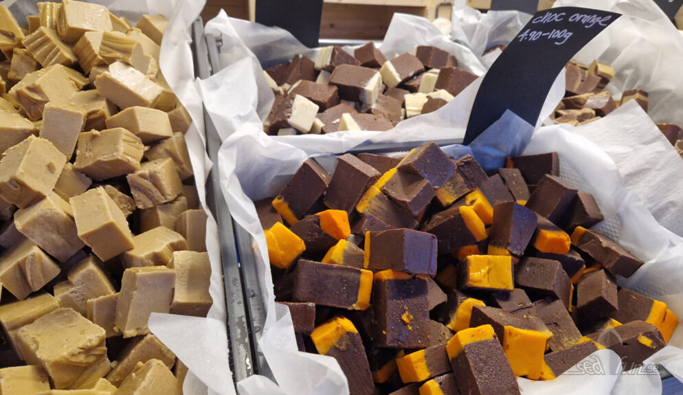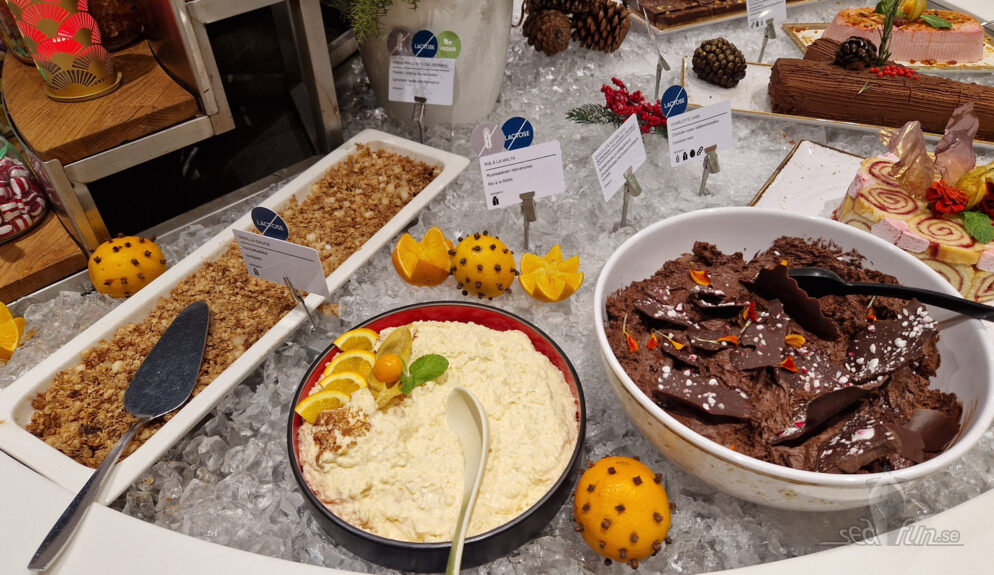 Dessertutbudet är alltså generöst, visuellt läckert och fräscht (alla fat ligger på en bädd av is), men smakmässigt är några lite ”bleka”. Flera av desserterna tyckte jag mest smakade ”luft och pulver”, inte hembakat smarrigt. Med ett undantag; nyheten choklad-apelsin-moussekakan! Mumsfillibabba!