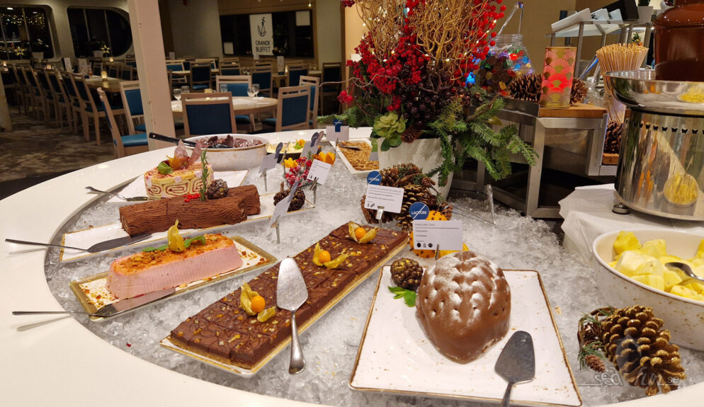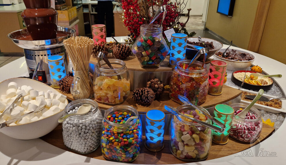 Silja Serenades dessertbord står (lite underligt nog) direkt vid entrén när man kommer in, som en slags trofé eller vinstbord: ”när du ätit dig igenom alla turer får du komma hit”. Här finns inte mindre än nio olika desserter, från ris à la malta till finsk kottekaka och julstubbe, plus många godissorter. Glass med våffla och olika såser samt godis ska också finnas (jag missade dem, de kanske serveras vid barnbordet).