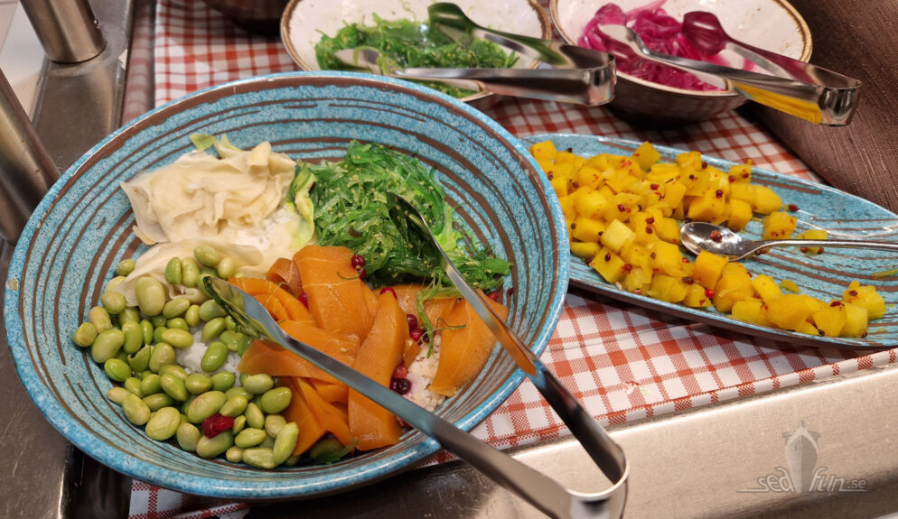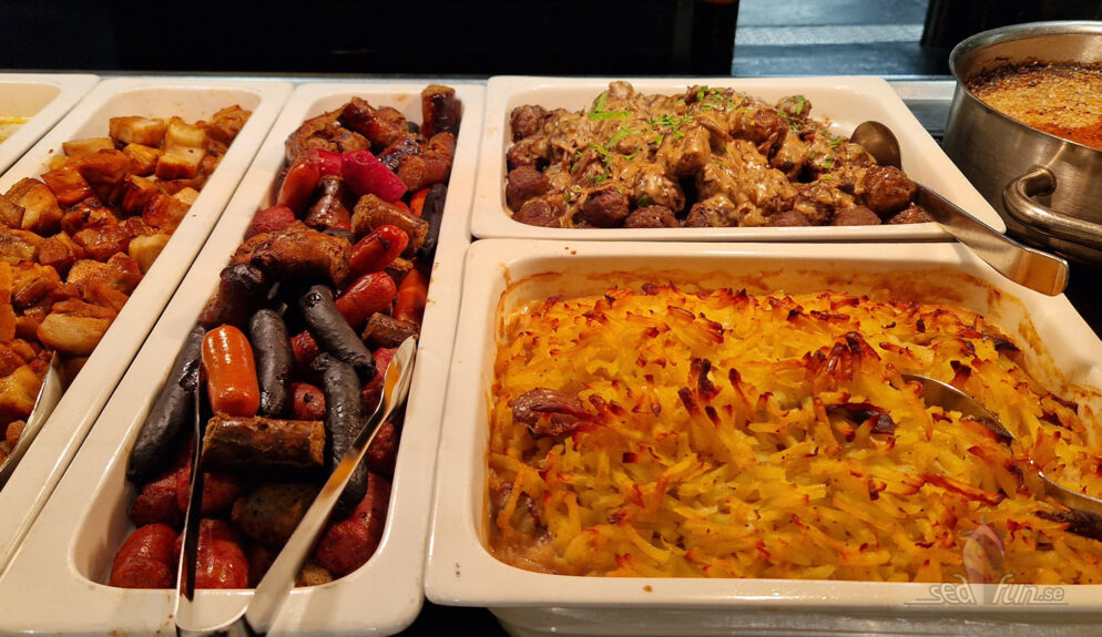 Viltköttbullarna fick mig att nästan stanna förvånat mitt i en tugga…och vad var det med såsen, men wow liksom…oj det här var ju jättegott! Den varma regnbågslaxen i sås var också fin liksom att jag ger godkänt och lite till, till de finska lådorna som lagas ombord. Möjligen mer mosiga/krämiga än jag är van vid men smaken var rätt. Och skinkan får godkänt.