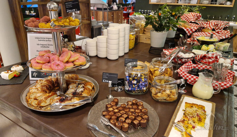 Här står dels som en liten buffé med kallskuret, sallader, skagenröra, läcker lax och annat…men det finns också en varm sektion med äggröra, korv och allt från stekta champinjoner till små mini-pannkakor och mini-omelett-muffins och annat gott.