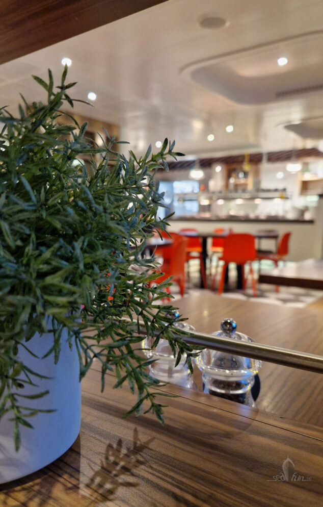 Kvällens middag åt jag på Happy Lobster, en av fartygets hela sex restauranger. De andra fem är Grande Buffet och Tavolàta som jag redan berättat om, Grill House, Bon Vivant och Fast Lane. Jag fick ett bord lite ute på promenaden vilket är kul när man nu äter på ett fartyg som är själva föregångaren till alla de kryssningsfartyg som har just en lång promenad i mitten (vilket exempelvis både Royal Caribbean och MSC Cruises har). Mer om Happy Lobster och min läckra middag kommer (jag länkar här när det är klart).
